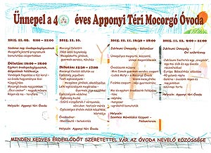 2015. november 09 és 12 között ünnepli 40 éves fennállását az Apponyi Téri Mocorgó Óvoda. A plakáton látható rendezvényekre várják a jelenlegi és a volt óvodásokat.