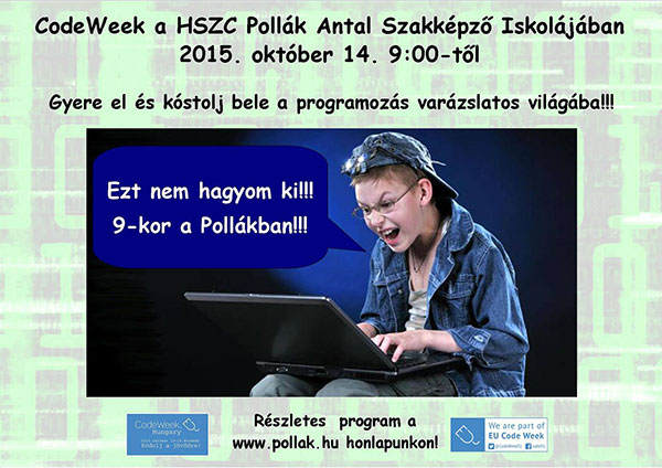 A Hódmezővásárhelyi SZC Pollák Antal Szakképző Iskolája az elmúlt héten 2015. október 14-én várta a fiatalokat, hogy a vonzó és érdekes oldalát mutassa meg a programozásnak és, hogy eloszlassák a tévhiteket. 2015. október 21-én nyílt órákon tekinthetünk be az ott folyó képzésbe, így a leendő tanulók közvetlen az iskolaéletbe nyernek betekintést. Reggel 8.00 órától 10.35-ig az első három tanítási órában 15 helyszínen látogathatók az órák!