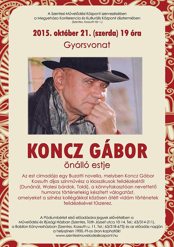 A Szentesi Művelődési Központ szervezésében a Megyeháza Konferencia és Kulturális Központ dísztermében (Szentes, Kossuth tér 1.) 2015. október 21. (szerda) 19 órai kezdettel tekinthetjük megy "Gyorsvonat" címmel KONCZ GÁBOR önálló estjét.