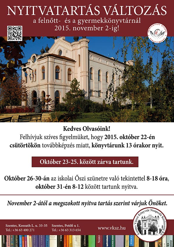 Kedves Olvasók! NYITVATARTÁS VÁLTOZÁS a felnőtt- és a gyermekkönyvtárnál 2015. november 2-ig!
