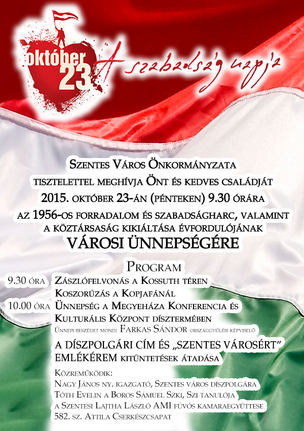 Szentes Város Önkormányzata tisztelettel meghívja Önt és kedves családját 2015. október 23-án (pénteken) 9.30 órára az 1956-os forradalom és szabadságharc, valamint a köztársaság kikiáltása évfordulójának VÁROSI ÜNNEPSÉGÉRE