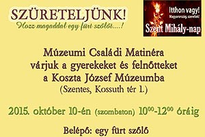 2015. október 10-én szüreti kézműves foglalkozás, ismerkedés a szüreti eszközökkel, préselés, darálás, mustkészítés, kóstolás a Koszta József Múzeumban! Belépő: 1 fürt szőlő!!!