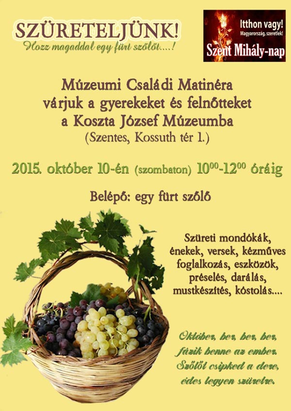 2015. október 10-én szüreti kézműves foglalkozás, ismerkedés a szüreti eszközökkel, préselés, darálás, mustkészítés, kóstolás a Koszta József Múzeumban! Belépő: 1 fürt szőlő!!!