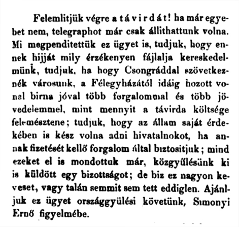 gazdasági fellendülés érdekében hőn óhajtott távíróvonal és egy szentesi