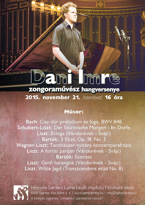 Dani Imre zongorista pályájának első sikereit a szentesi zeneiskolában érte el, Nagy János tanár úr növendékeként. A Zeneakadémia zongoraművész mesterszakának végzett volt növendék újra Szentesen ad zongoraestet 2015. november 21-én, szombaton 16.00 órai kezdettel.
