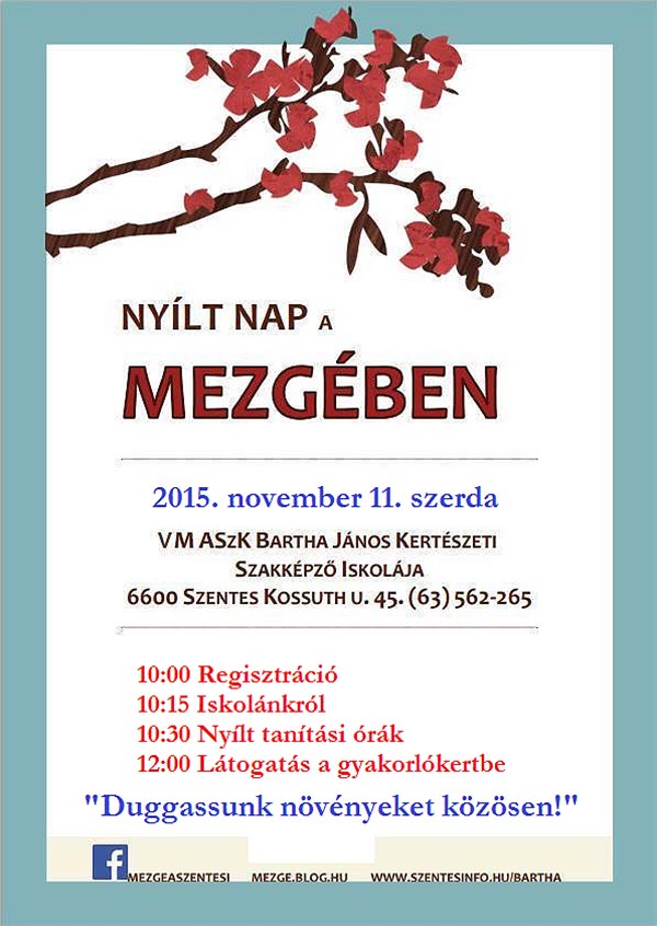 2015. november 11-én, második alkalommal lesz nyílt nap a Mezgében. Ismét szeretettel várják az érdeklődőket, végzős általános iskolai diákokat , akik megismerkedhetnek az iskola életével. Az iskola és a képzések bemutatását követően, élmény beszámolót tartanak a Belgiumban, szakmai programon résztvevő diákok. A vendégeink nyílt órákon megtudhatják, hogy miért jó és mire használható a tök, állattenyésztésből fény derül a nagy titokra, hogy miért vörös a tehén?. Ezek után izgalmas angol órát is láthatnak. A program következő állomása a tangazdaság lesz, ahol ki lehet próbálni a dísznövények dugványozását, a gyümölcsfák oltását, a Ferrari kistraktort is.