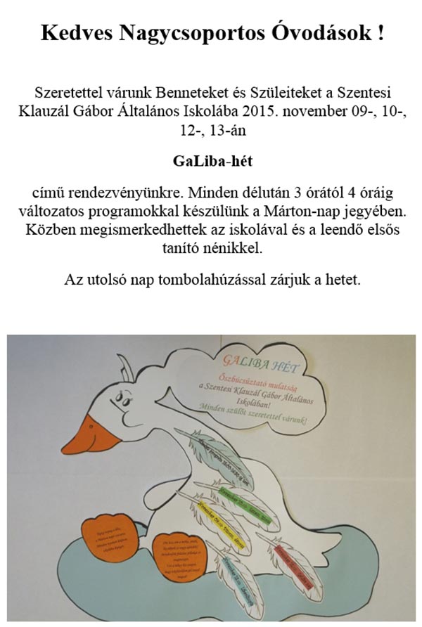 A Szentesi Klauzál Gábor Általános Iskola szeretettel várja a nagycsoportos óvodásokat és szüleiket november 9-én, hétfőn, 10-én, kedden, 12-én csütörtökön és 13-án pénteken GaLiba-hét elnevezésű programjára a Márton-nap jegyében. A programok minden nap 15 órakor kezdődnek az intézmény ebédlőjében. Érdekes bemutatók keretében ismerkedhet meg mindenki az iskolában folyó nevelő-oktató munkával, az intézmény profiljával és a leendő elsős tanító párosokkal. Ízelítő a programokból: lúdgége sütés, eszem-iszom, kézműveskedés, csigatésztából karkötő készítés, bábjáték, táncbemutatók, dínomdánom, versek, dalok, bábjáték, táncház, libaolimpia, hangszeres játék, puzzle kirakás, óriás társasjáték. Mindennap meglepetés ajándék. A pénteki zárónapon pedig tombolahúzás. Szeretettel várunk minden érdeklődőt!
