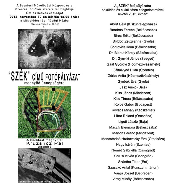 A Szentesi Művelődési Központ és a Szentesi Fotókör szeretettel meghívja Önt és kedves családját 2015. november 30-án hétfőn 18.00 órára a Művelődési és Ifjúsági Házba (Szentes, Tóth J. u. 10-14.) a „SZÉK” című fotókiállításra. A kiállítást megnyitja Kruzslicz Pál újságíró