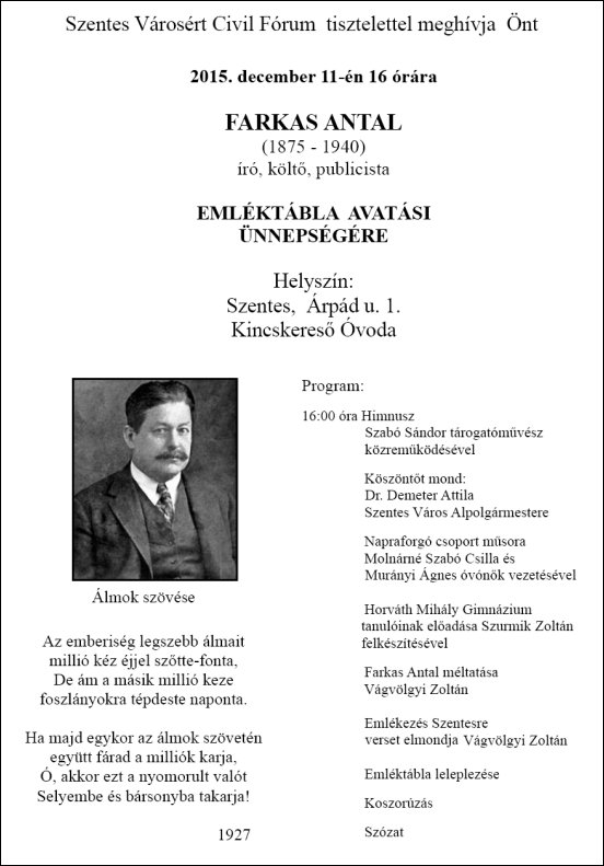 Farkas Antal (1875-1940) író, költő születésének és halálának kerek évfordulója alkalmából emléktáblát avatnak 2015. december 11-én a nevét viselő utca és az Árpád utca sarkán álló óvodaépületnél. A kezdeményező Szentes Városért Civil Fórum közadakozásból finanszírozza a táblaállítást, mellyel az emlékhelyekben nem bővelkedő Kisér városrészt is gazdagítani kívánják. Szeretettel várnak minden érdeklődőt péntek délután 4 órakor egy rövid avató ünnepségre és egy forró teára.