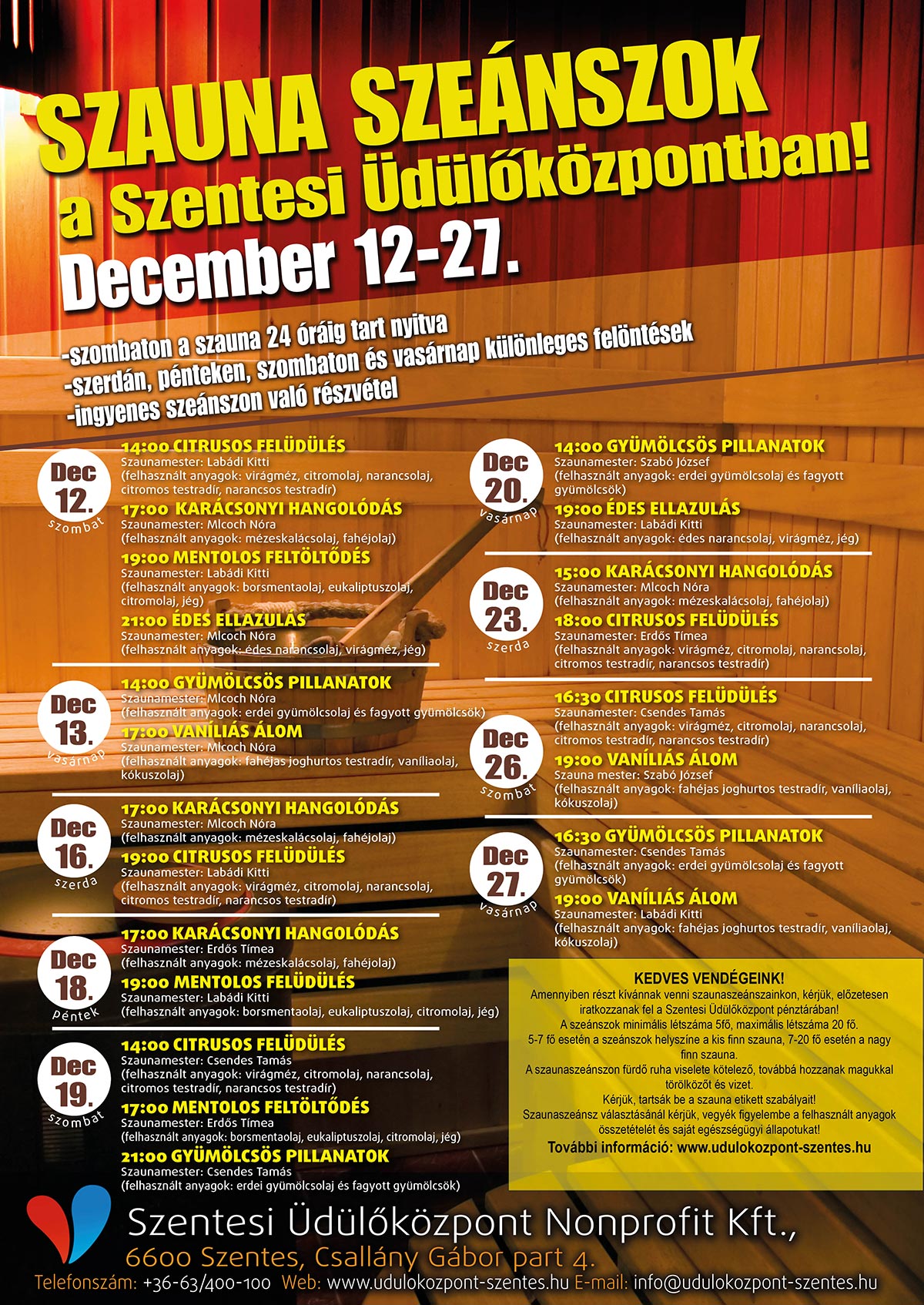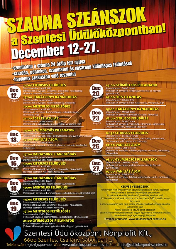 Hétvégi ízelítő: December 12. (szombat) 14:00 CITRUSOS FELÜDÜLÉS - Szaunamester: Labádi Kitti (felhasznált anyagok: virágméz, citromolaj, narancsolaj, citromos testradír, narancsos testradír) 17:00 KARÁCSONYI HANGOLÓDÁS - Szaunamester: Mlcoch Nóra (felhasznált anyagok: mézeskalácsolaj, fahéjolaj, alma, narancs) 19:00 MENTOLOS FELTÖLTŐDÉS - Szaunamester: Labádi Kitti (felhasznált anyagok: borsmentaolaj, eukaliptuszolaj, citromolaj, jég) 21:00 ÉDES ELLAZULÁS - Szaunamester: Mlcoch Nóra (elhasznált anyagok: édes narancsolaj, virágméz, jég)