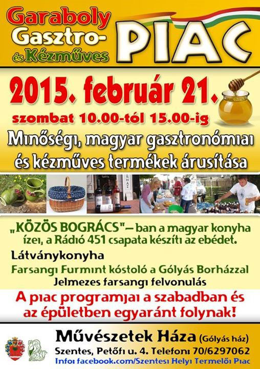 Szeretettel várunk a farsang vidám hangulatát idéző Gasztro Piacunkra: a Gólyás Borház furmint kóstolójával, farsangi felvonulással és a közös bográcsunk magyaros ebédjével, amit most a Rádió 451 csapata főz. Ha velük ebédelsz, hajléktalan embereken is segítesz.