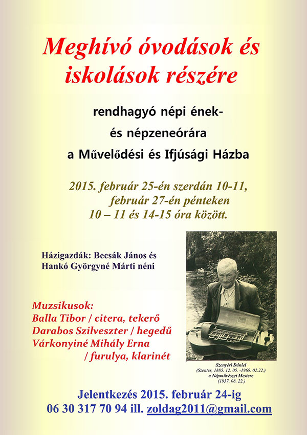 Meghívó az óvodások és iskolások részére a rendhagyó népi ének- és népzeneórára a Művelődési és Ifjúsági Házba, mely 2015. február 25-én szerdán 10-11, február 27-én pénteken 10 —11 és 14-15 óra között kerül megrendezésre. Házigazdák: Becsák János és Hankó Györgyné Márti néni Muzsikusok: Balla Tibor / citera, tekerő Darabos Szilveszter / hegedű Várkonyiné Mihály Erna / furulya, klarinét