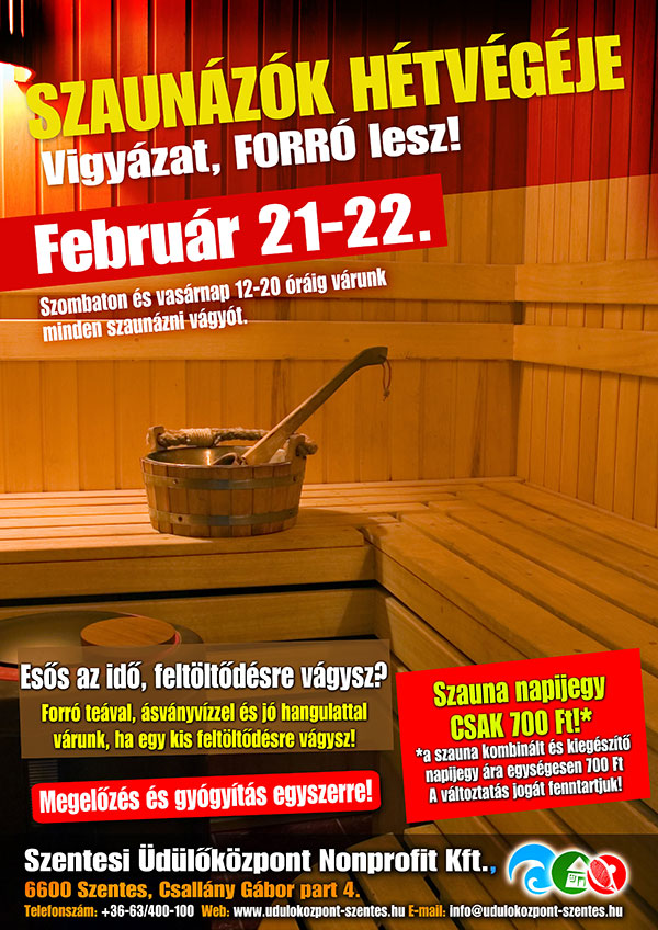 Vigyázat forró lesz! 2015. február 21 és 22-én ismét szaunázók hétvégéje a Szentesi Üdülőközpontban! Szombaton és vasárnap 12-20 óráig sok szeretettel várunk minden szaunázni vágyót. Szauna napijegy CSAK 700 Ft!* Kellemes kikapcsolódást és jó szaunázást kívánunk! *a szauna kombinált és kiegészítő napijegy ára egységesen 700 Ft!