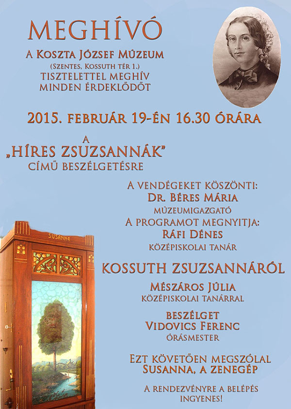 Az elmúlt hétvégén a jó időnek köszönhetően a városban több helyen lehetett hallani hogy dalolnak a pacsirták így már nincs akkora felelősége a Zsuzsanna napnak az idén mert már érezhető, hogy hamarosan itt a tavasz. 2015. február 19-én ismételten megrendezi Zsuzsanna napi rendezvényét a Koszta József Múzeum. A 16 óra 30 perckor kezdődő előadásra mindenkit szeretettel várnak, ahol a vendégeket köszönti Dr. Béres Mária múzeumigazgató és a programot megnyitja Ráfi Dénes középiskolai tanár. Ezután "A híres Zsuzsannák" című beszélgetésen Mészáros Júlia nyugalmazott középiskolai tanárral Vidovics Ferenc órás mester beszélget. Ezt követően ismételten megszólal a Sussana zenegép. A rendezvényre a belépés ingyenes, mindenkit sok szeretettel várnak!