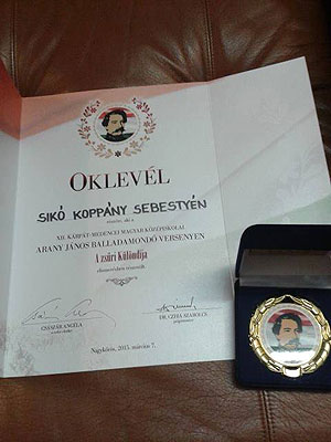 Mindkét diák - a szombat délelőtti elődöntő után - bejutott a 32 fős délutáni döntőbe, ahol kiemelkedően szerepeltek. Sikó Koppány Sebestyén a zsűri Különdíját nyerte el, amelyhez egy gyönyörű, Arany Jánost ábrázoló emlékplakett is járt! A diákok felkészítő tanára: Szurmik Zoltán