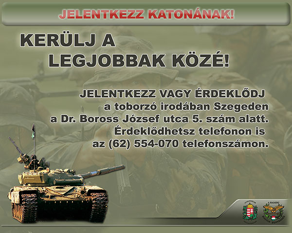 Ha befejezted tanulmányaidat és szeretnél szolgálatot vállalni a Magyar Honvédség kötelékében mint szerződéses katona, érdeklődj a Toborzó Irodában! Ha elmúltál már 18 éves, büntetlen előéletű vagy, középfokú végzettséggel, vagy "C" kategóriás jogosítvánnyal rendelkezel, alkalmasnak érzed magad, vagy csak egyszerűen vonzanak a kihívások.