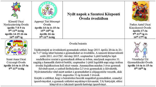Klauzál Utcai Nyolcszínvirág Óvoda április 7-8-9-én 9.00-11.00 óráig április 14-15-16-án 16.00-18.00-ig Apponyi Téri Mocorgó Óvoda április 14-én és 15-én 15.30-18.00-ig április 16-án 9.00-11.30 óráig Farkas Antal Utcai Kincskereső Óvoda április 17-én 9.00-11.30-ig és 16.00-17.00-ig Szent Anna Utcai Csicsergő Óvoda április 14-én és 15-én 9.30-11.30 óráig Vásárhelyi Úti Gyermekkuckó Óvoda április 14-én és 15-én 8.00-16.00-ig