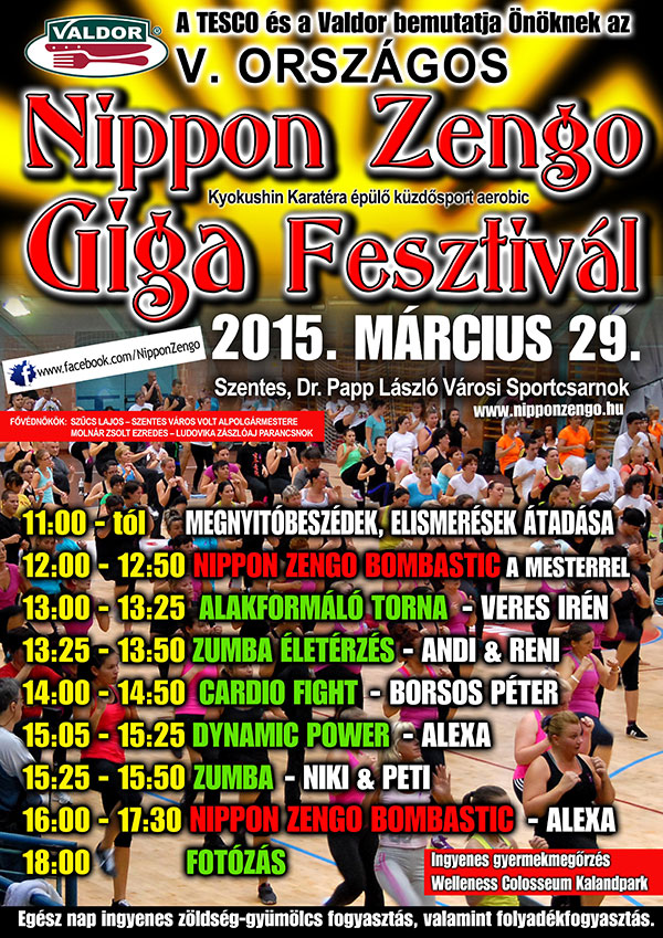 Immáron ötödik alkalommal gyűlnek össze a Nippon Zengo rajongói Szentesen a Dr. Papp László Városi Sportcsarnokban, ahol az idén igazán színes sportprogramról gondoskodnak a szervezők. Minden sportolni, vagy csak kipróbálni vágyót várnak 2015. március 29-én az INGYENES fesztiválra, ahol egész nap ingyenes lesz a zöldség-gyümölcs fogyasztás, valamint folyadék utánpótlás. Ingyenes kalandpark és gyermekfelügyelet is lesz így bárki hozhatja gyerkőcét is. Ha valaki nem tudná, hogy pontosan milyen mozgásforma a Nippon Zengo akkor íme egy kis ízelítő az előző fesztiválból: A Nippon Zengo az abszolút ősi Kyokushin Karatéra épülő mozgáskultúra. Ez az egyik legújabb küzdősport-aerobik, mely mind mentalitásában, mind gyakorlati végrehajtásában a leggyorsabb, a legkeményebb és a leghatékonyabb mozdulatokra törekszik, mind az ütések, mind a rúgások, mind a védések terén. A mozgásforma valóban realista, igazi önvédelmi elemeket nyújt, amely az aerobik lazaságával, könnyedségével tízezrek örök szenvedélyévé válhat. A Nippon Zengo mozgáskultúrájából és bombasztikus tempójából eredően egy kiemelkedő cardiomuscularis hatással rendelkezik, melynek köszönhetően a fogyni, erősödni és alakot formálni vágyó, valamint egészséges életmódot követő tömegek tökéletes zsírégető programja lehet.