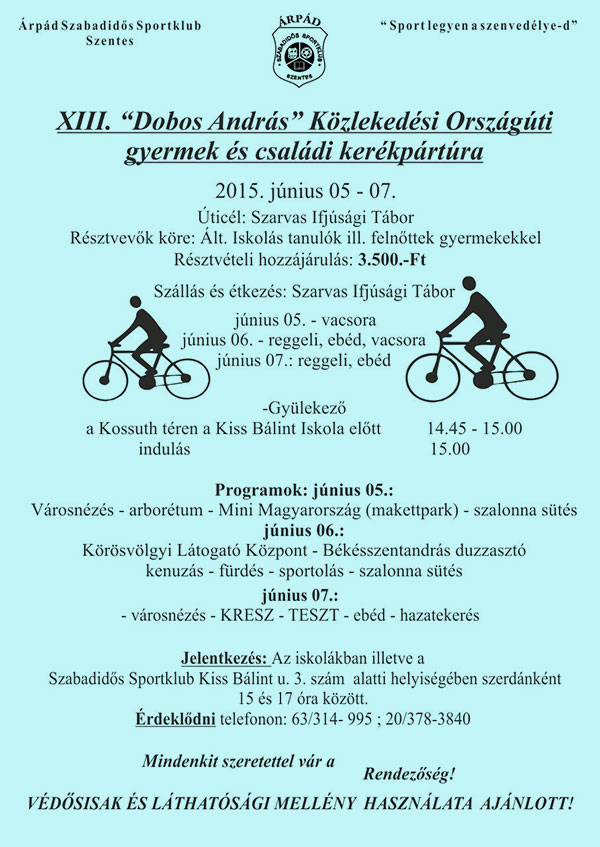 Immáron tizenharmadik alkalommar rendezi meg az Árpád Szabadidős Sportklub a "Dobos András" Közlekedési Országúti gyermek és családi kerékpártúrát. További részletek a plakáton!