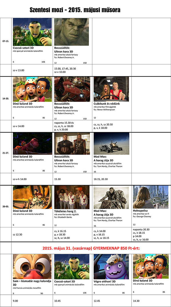 2015. május utolsó vasárnapján már reggel 9.. órától várják a mozirajongó gyermekeket a Szentesi Moziba, ahol gyermeknapi akció keretében egységesen 850,- Ft-os áron tekinthetnek meg négy nagysikerű animációs filmet. Foglalja le Ön is gyermeke számára ezt a felejthetetlen meglepetést a www.szentesimozi.hu oldalon! Kinagyítható!