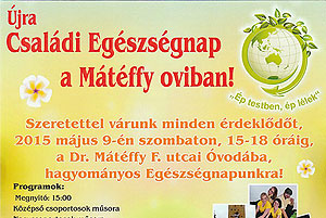 Újra Családi Egészségnapot rendeznek a Mátéffy oviban 2015. május 9-én, szombaton 15.00 - 18.00 óra között. Játékos sorversenyek, arcfestés, légvár, kalandpark stb. várja a résztvevőket.