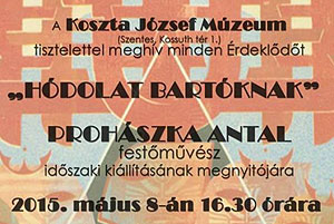 „A művészet megtisztít, felemel az újraalkotás nehéz szépsége által” - ez a művészi ars poeticája Prohászka Antalnak. A nyolcvan éves alkotó „Hódolat Bartóknak” című kiállítása nyílik meg 2015. május 8-án 16 óra 30 perckor a Koszta József múzeumban. További részletek a plakáton!