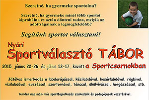Sportválasztó táborba várják azokat a 7-12 év közötti fiatalokat, akik még nem tudták eldönteni, hogy milyen sportot űzzenek szabadidejükben. Ha szeretnél több sportot kipróbálni, akkor jelentkezz a 2015. június 22-26 és július 13-17 között megrendezendő táborba. A részleteket a plakátról elolvashatod!