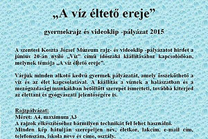 A szentesi Koszta József Múzeum rajz- és videoklip pályázatot hirdet a június 20-án nyíló "Víz" című időszaki kiállításhoz kapcsolódóan, melynek témája "A víz éltető ereje". További részletek a plakáton!
