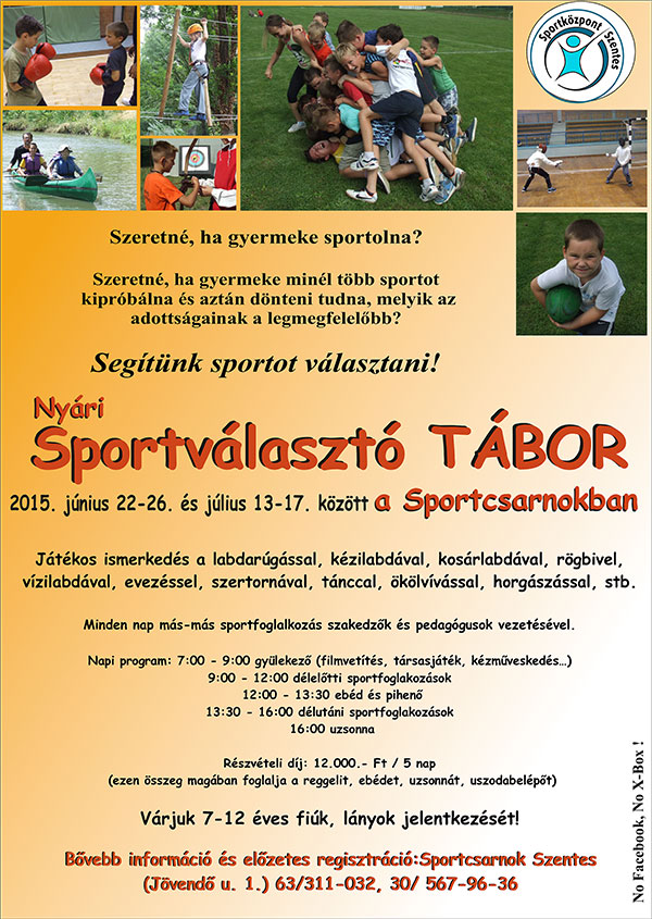 Sportválasztó táborba várják azokat a 7-12 év közötti fiatalokat, akik még nem tudták eldönteni, hogy milyen sportot űzzenek szabadidejükben. Ha szeretnél több sportot kipróbálni, akkor jelentkezz a 2015. június 22-26 és július 13-17 között megrendezendő táborba. A részleteket a plakátról elolvashatod!