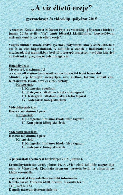 A szentesi Koszta József Múzeum rajz- és videoklip pályázatot hirdet a június 20-án nyíló "Víz" című időszaki kiállításhoz kapcsolódóan, melynek témája "A víz éltető ereje". További részletek a plakáton!