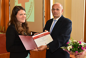 A Magyar Vöröskereszt Ifjúsági Vöröskeresztes Munkáért Elismerő Oklevelet adományoz: Sipos Réka csongrádi-szentesi önkéntesnek Réka 5 éve végez önkéntes munkát. Lakhelye Szentes közelében van, iskolába pedig a csongrádi Batsányi János Gimnáziumba jár, így mindkét terület munkáját segíti. Példamutató magatartásával, segítőkészségével kitűnik társai közül.