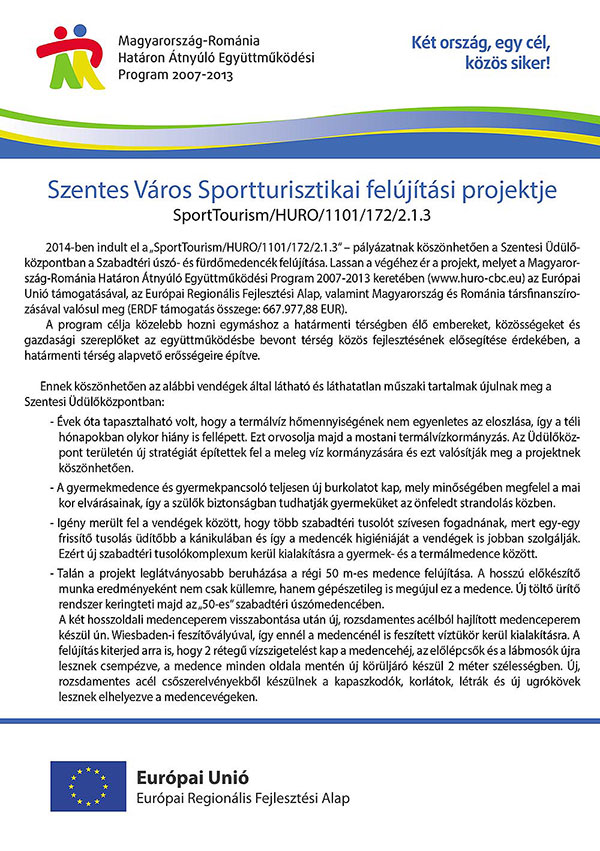 2014-ben indult el a „SportTourism/HURO/1101/172/2.1.3” – pályázatnak köszönhetően a Szentesi Üdülőközpontban a Szabadtéri úszó- és fürdőmedencék felújítása. Lassan a végéhez ér a projekt, melyet a Magyarország-Románia Határon Átnyúló Együttműködési Program 2007-2013 keretében (www.huro-cbc.eu) az Európai Unió támogatásával, az Európai Regionális Fejlesztési Alap, valamint Magyarország és Románia társfinanszírozásával valósul meg (ERDF támogatás összege: 667.977,88 EUR). A program célja közelebb hozni egymáshoz a határmenti térségben élő embereket, közösségeket és gazdasági szereplőket az együttműködésbe bevont térség közös fejlesztésének elősegítése érdekében, a határmenti térség alapvető erősségeire építve.