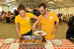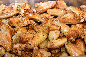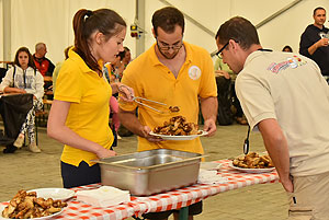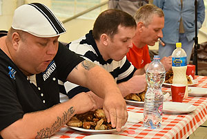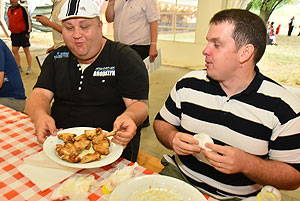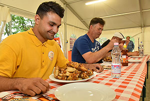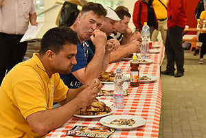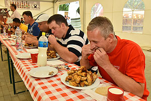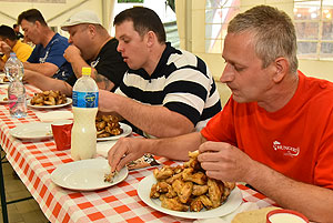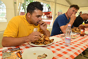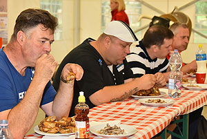 Hatalmas versenynek indult (és az is lett) az idei Szárnyas Napok első versenyszáma a csirkeszárny evés. Bihari István, Pete Áron, Ady Zoltán, Lackó Péter és Őri József küzdött meg a több mint 2 kg-os sült csirkeszárny adagokkal. A versenyzők között három tapasztalt versenyző (István, Péter, József) mellett két újonc szinte szűz gyomorral (Zoltán és Áron) ült tányérhoz.
