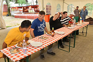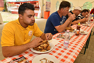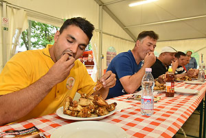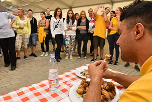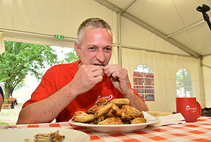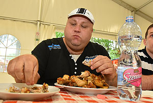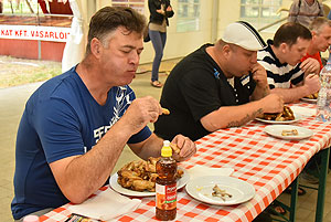 Bertók Róbert főszervezőtől megtudtuk, hogy 20 perc áll rendelkezésükre, hogy elfogyasszák a kikészített 28 db (több mint 2 kg) csirkeszárnyt.