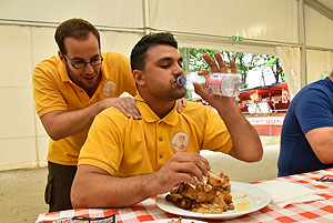 A közönség az idő előrehaladtával egyre hangosabban kiabálta kedvence nevét, de Pete Áront senki sem tudta megszorítani. 14 perc 14 mp-el új rekordot állított fel! Már az induláskor látszott Áron arcán az összpontosítás. Másfél liter tejjel készült a temérdek csirkeszárny mellé, melyet már is alkalmazott. Árontól megtudtuk, hogy edzésként (bemelegítésként) délben gyrossal történt a gyomortágítás, így üdítő volt a nehéz ebédre a könnyű és fimon csirkeszárny! :-)
