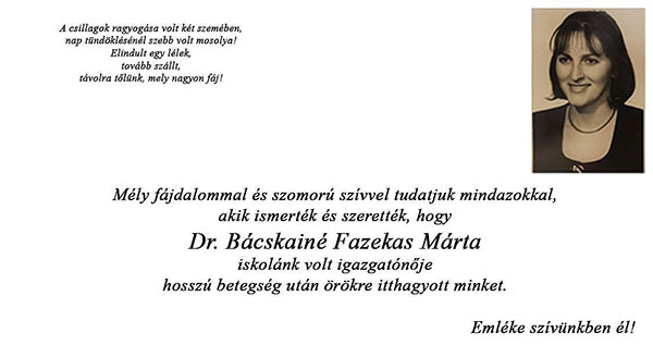 Hosszú küzdelem után búcsúznunk kell Bácskainé Fazekas Mártától a Horváth Mihály Gimnázium volt igazgatójától, tanárától!