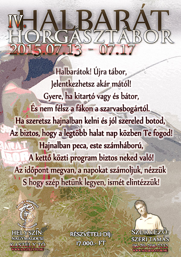 Halbarátok! Újra tábor, Jelentkezhetsz akár mától! Gyere, ha kitartó vagy és bátor, És nem félsz a fákon a szarvasbogártól. Ha szeretsz hajnalban kelni és jól szereled botod, Az biztos, hogy a legtöbb halat nap közben Te fogod! Hajnalban peca, este számháború, A kettő közti program biztos neked való! Az időpont megvan, a napokat számoljuk, nézzük S hogy szép hetünk legyen, ismét elintézzük!