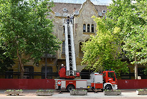 - A korábban megszakadt munkák részeként a városközpont egy részét ellátó távhővezeték ideiglenesen az épület falára került, így az esetleg később meginduló munkáknak ez akadályát képezi. Ezért a távfűtési szezon előtt a nyár folyamán a vezetéket a járdába a végleges helyére helyezzük, hogy egy esetleges támogatás megnyerése esetén akár az ősz folyamán is hozzá lehessen fogni kisebb-nagyobb munkálatokhoz. A napokban a Szentes Városi Szolgáltató Kft. munkatársai megkezdték a távhővezetéknek a járdába történő végleges elhelyezési munkálatait. E két munka végrehajtását végző kollégák tevékenysége látható a napokban megbontott palánkok mögött.