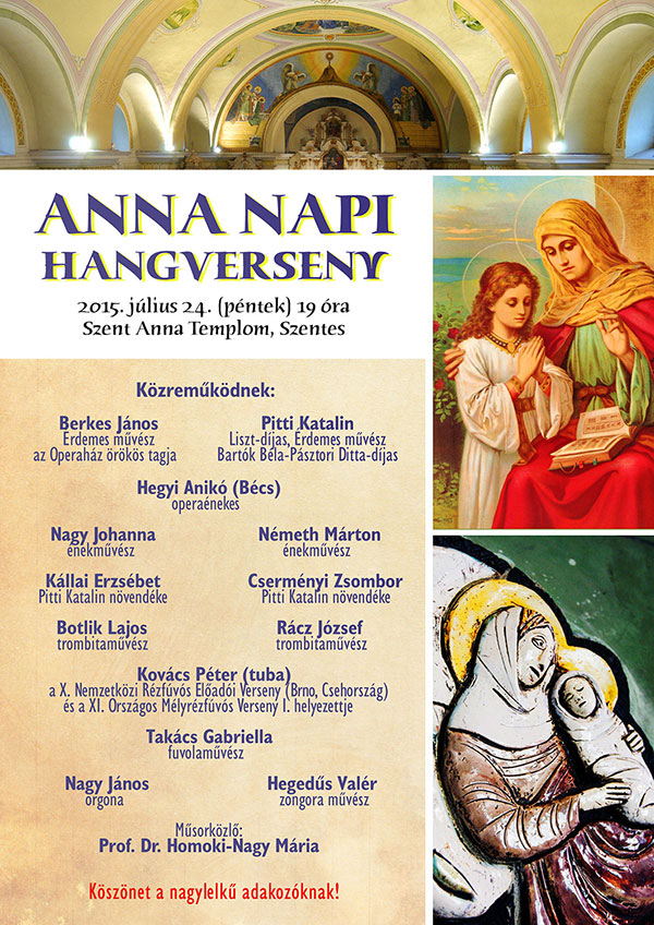 2015. július 24-én ANNA NAPI HANGVERSENY lesz Szentesen a Szent Anna Templomban, ahol olyan énekesek lépnek fel, mint Berkes János, Pitti Katalin, Hegyi Anikó, Nagy Johanna, Németh Márton, Kállai Erzsébet és Cserményi Zsombor. Közreműködnek: Kovács Péter, Takács Gabriella, Nagy János, Hegedűs Valér és Prof. Dr. Homoki-Nagy Mária.