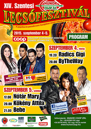 A Hunor Coop ZRt. szeretettel meghív minden kedves érdeklődőt a XIV. Szentesi Lecsófesztiválra és Családi napjára. A lecsó a magyar nyár kihagyhatatlan, és klasszikus fogása, amire mindenkinek megvan a maga tuti receptje. Szeptember első hétvégéjén a Szentesi Lecsófesztivál ideje alatt ezrek lepik el Szentes utcáit, ahol a helyi lecsókészítés rejtelmeibe nyerhetünk betekintést. Hívjuk, várjuk Önt és barátait a XIV. Szentesi Lecsófesztiválra 2015. szeptember 4-5-én, főzze meg Ön a fesztivál legjobb lecsóját.