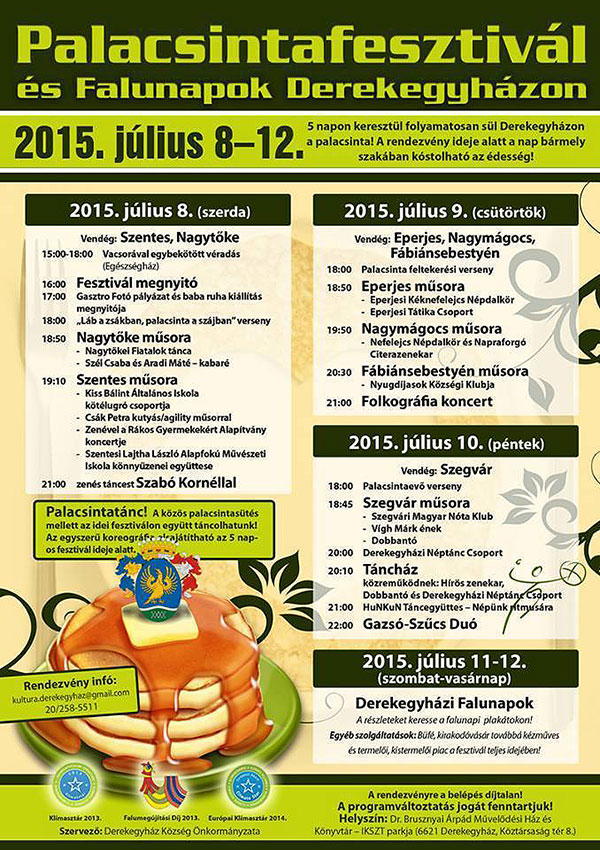 2015. július 8-12. között rendezi meg Derekegyház község a falunapját. Ennek keretében öt napon keresztül sül a palacsinta a faluban és minden nap más-más település adja a műsort. Július 8-án 16 órától a szentesi sportolók és civil szervezetek tagjai fogják sütni a palacsintát. Ezen a napon Szentessel közös önkormányzati egységet alkotó nagytőkei fiatalok táncát tekinthetjük meg 18 óra 50 perctől, majd Szél Bence és Aradi Máté kabaréműsorán szórakozhatunk. 19 óra 10 perctől a Kiss Bálint Kötélugró Klub próbálja leugrálni a palacsintaevés súlyos terheit, majd egy különleges kutyás program szemtanúi lehetünk....