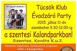 A Tücsök Zenekar Tücsök Klub Évadzáró Party-t szervez 2015. július 11-én (szombaton) 9.30-12.00-ig a szentesi Kurca-part Kalandparkban (Szentes, Kováts K.u.2. ). Program: - Kézműves foglalkozás - Szórakoztató programok - Játék a Kalandparkban - Tücsök Zenekar Kalózmese című műsora