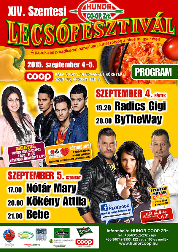A Hunor Coop ZRt. szeretettel meghív minden kedves érdeklődőt a XIV. Szentesi Lecsófesztiválra és Családi napjára. A lecsó a magyar nyár kihagyhatatlan, és klasszikus fogása, amire mindenkinek megvan a maga tuti receptje. Szeptember első hétvégéjén a Szentesi Lecsófesztivál ideje alatt ezrek lepik el Szentes utcáit, ahol a helyi lecsókészítés rejtelmeibe nyerhetünk betekintést. Hívjuk, várjuk Önt és barátait a XIV. Szentesi Lecsófesztiválra 2015. szeptember 4-5-én, főzze meg Ön a fesztivál legjobb lecsóját.