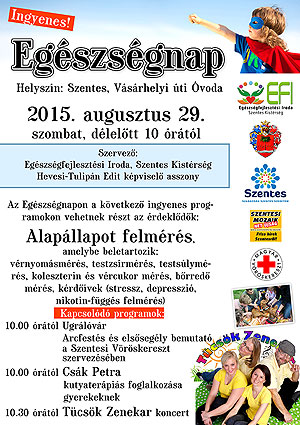 2015. augusztus 29-én szombat, délelőtt 10 órától várnak minden érdeklődőt Szentesen a Vásárhelyi úti Óvodába, ahol az Egészségfejlesztési Iroda EGÉSZSÉGNAPOT szervez.