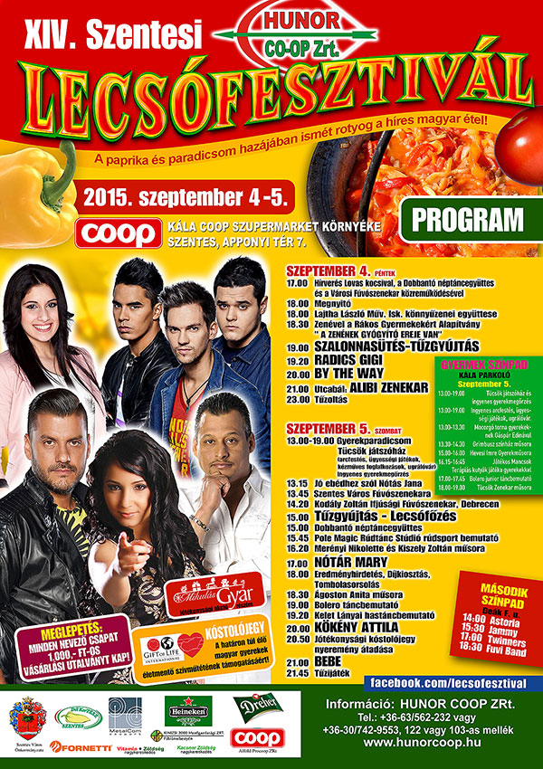 Végre felszáll a fehér füst a Szentesi Lecsófesztivál részletes programjáról, melyre a Hunor Coop ZRt. szeretettel meghív minden kedves érdeklődőt. A lecsó a magyar nyár kihagyhatatlan, és klasszikus fogása, amire mindenkinek megvan a maga tuti receptje. Szeptember első hétvégéjén a Szentesi Lecsófesztivál ideje alatt ezrek lepik el Szentes utcáit, ahol a helyi lecsókészítés rejtelmeibe nyerhetünk betekintést. Hívjuk, várjuk Önt és barátait a XIV. Szentesi Lecsófesztiválra 2015. szeptember 4-5-én, főzze meg Ön a fesztivál legjobb lecsóját.