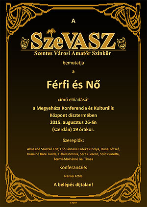2015. augusztus 26-án 19.00 órai kezdettel a Megyeháza Konferencia és Kulturális Körpont nagytermében mutatkozik be a SzeVASZ (Szentes Városi Amatőr Színkör) társulata. Az ingyenes előadás további részleteiről a plakátról tájékozódhat!