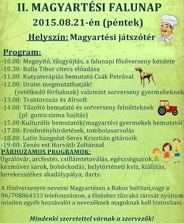 Immáron második alkalommal kerül megrendezésre a Magyartési Falunap, melyre minden érdeklődőt várnak. Lesznek igazán férfias versenyek, melyen még az "anyámasszonykatonája" is elindulhat.