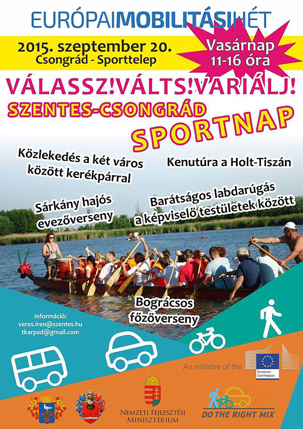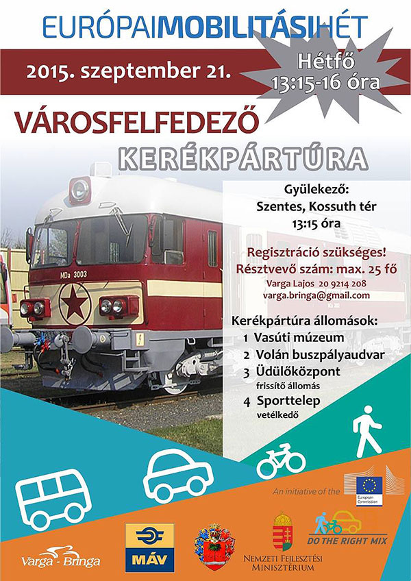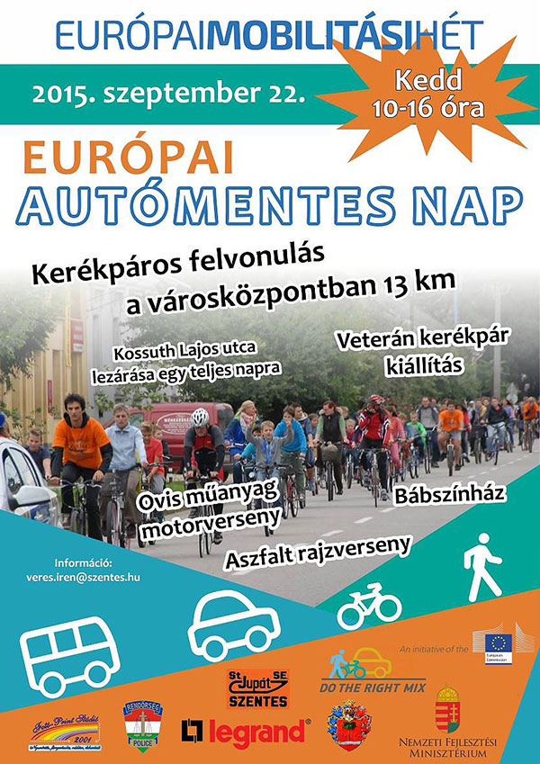 A 2015. év jelmondata Válassz!Válts!Variálj! vagyis-Találj a közlekedési módok között kapcsolatot. Szentes városa színes programokkal készül, hogy a helyi lakosok figyelmét felhívja a közvetlen környezetük megóvására és saját egészségük védelmére egyaránt.