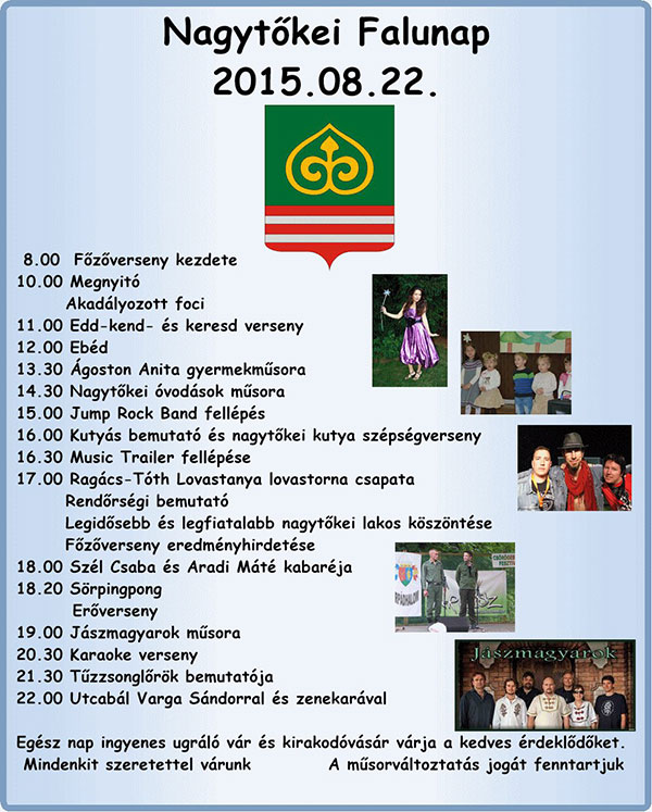 A településen egész napos programokkal várják az érdeklődőket 2015. augusztus 22-én (szombaton). Többek között sportmérkőzésekkel, versenyekkel, gyermek- és felnőtt színházakkal, főzőversennyel, koncerttel és utcabállal várnak mindenkit. További részletek a plakáton!