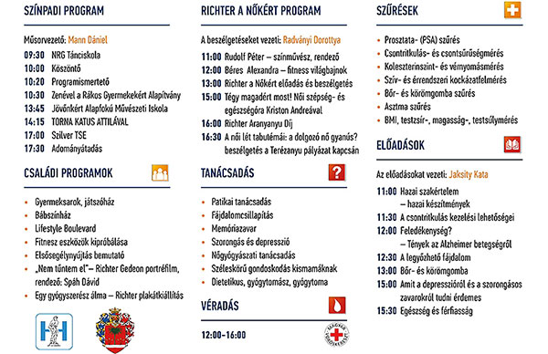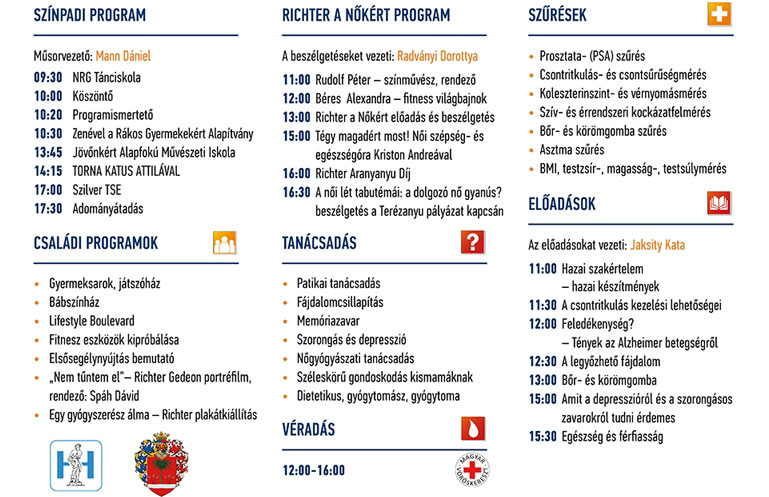 Részvételével Ön máris hozzájárult a kórháznak szánt adomány növeléséhez! A részvételért járó ponton kívül valamennyi szűrővizsgálatért, tanácsadáson való részvételért vagy előadás meghallgatásáért, tornáért, teszt kitöltéséért vagy a fitnesz eszközök használatáért további adománypontok járnak. A pontokat a sátrakban segédkező hoszteszek ragasztják be a füzetbe. A pontgyűjtő füzetben megtalálható minden fontos információ a programról, az igénybe vehető szolgáltatásokról, az előadásokról, valamint térkép segíti az eligazodást. Távozáskor, illetve 17 óráig ezt a perforált lapot kell leadni a Richter sátorban vagy az információs pontokon. A füzetet megőrizhetik saját szűrőadataikkal, azokat később megmutathatják háziorvosuknak. Távozás előtt ne feledje el leadni az info pontokon vagy a Richter sátorban! Fontos! Csak a leadott pontgyűjtő lapok növelik a kórháznak szánt adomány összegét. A beváltott pontokat – pontonként 300 forinttal számolva – a Richter forintban hozzáadja a kórház számára szánt adomány alapösszegéhez. Az ünnepélyes adományátadás 17.30 után kezdődik.
